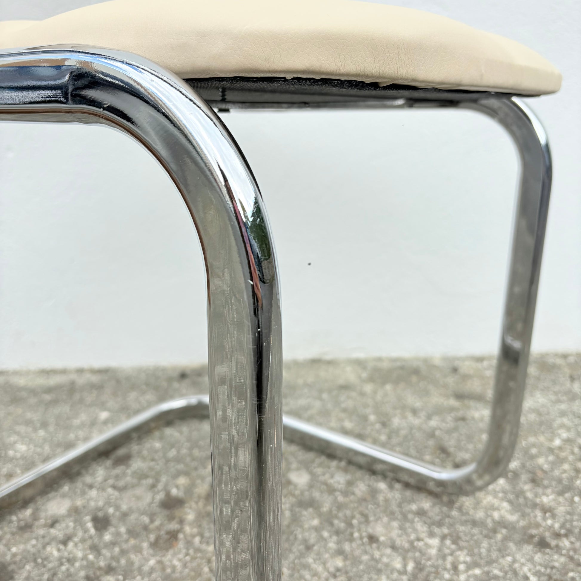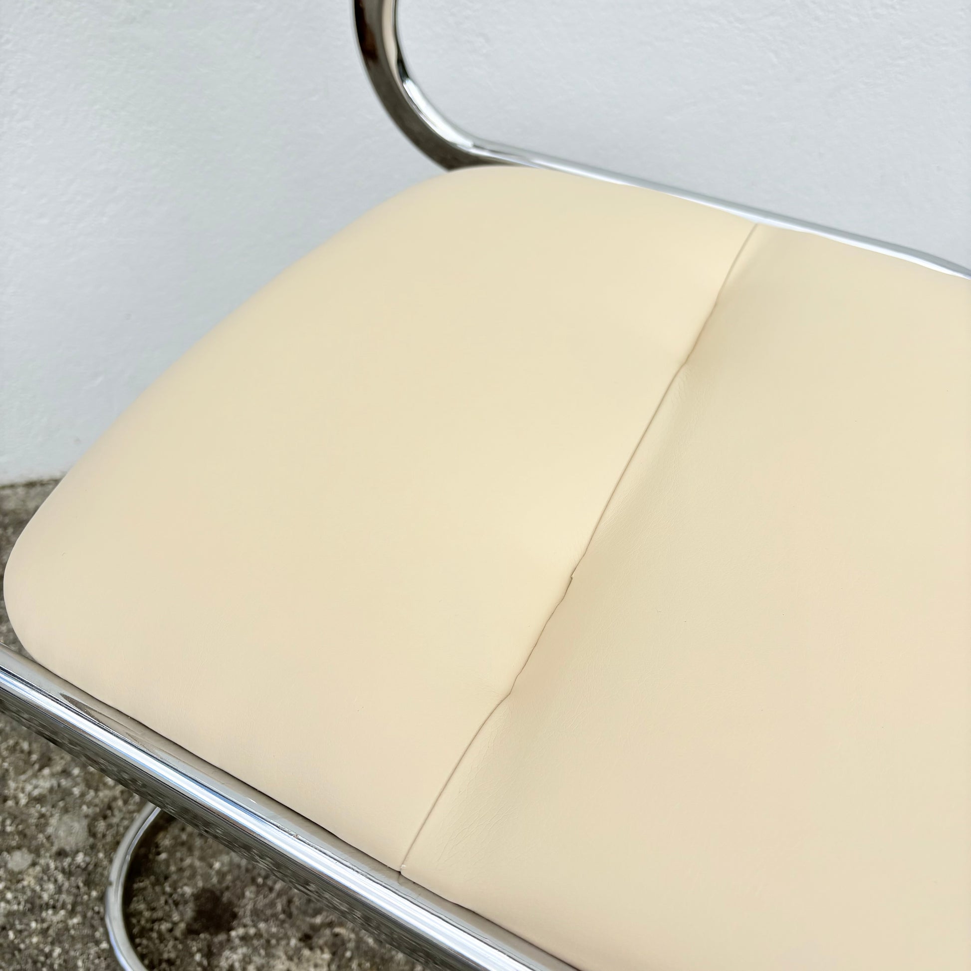 Chaise des années 70, entièrement restaurée. Simili cuir de qualité. Le chrome à quelques marques sur le pied. Très confortable. Idéal dans un intérieur Space age