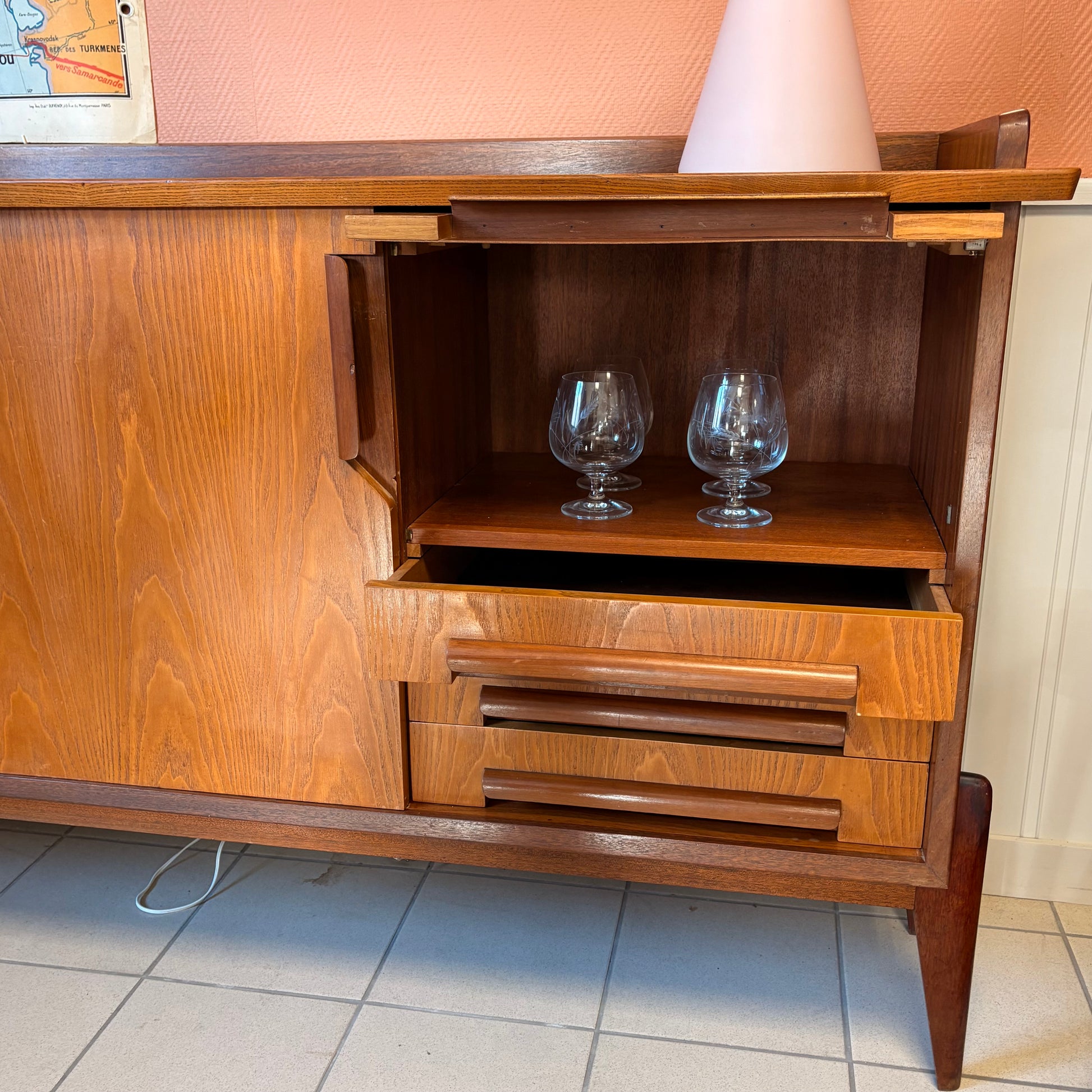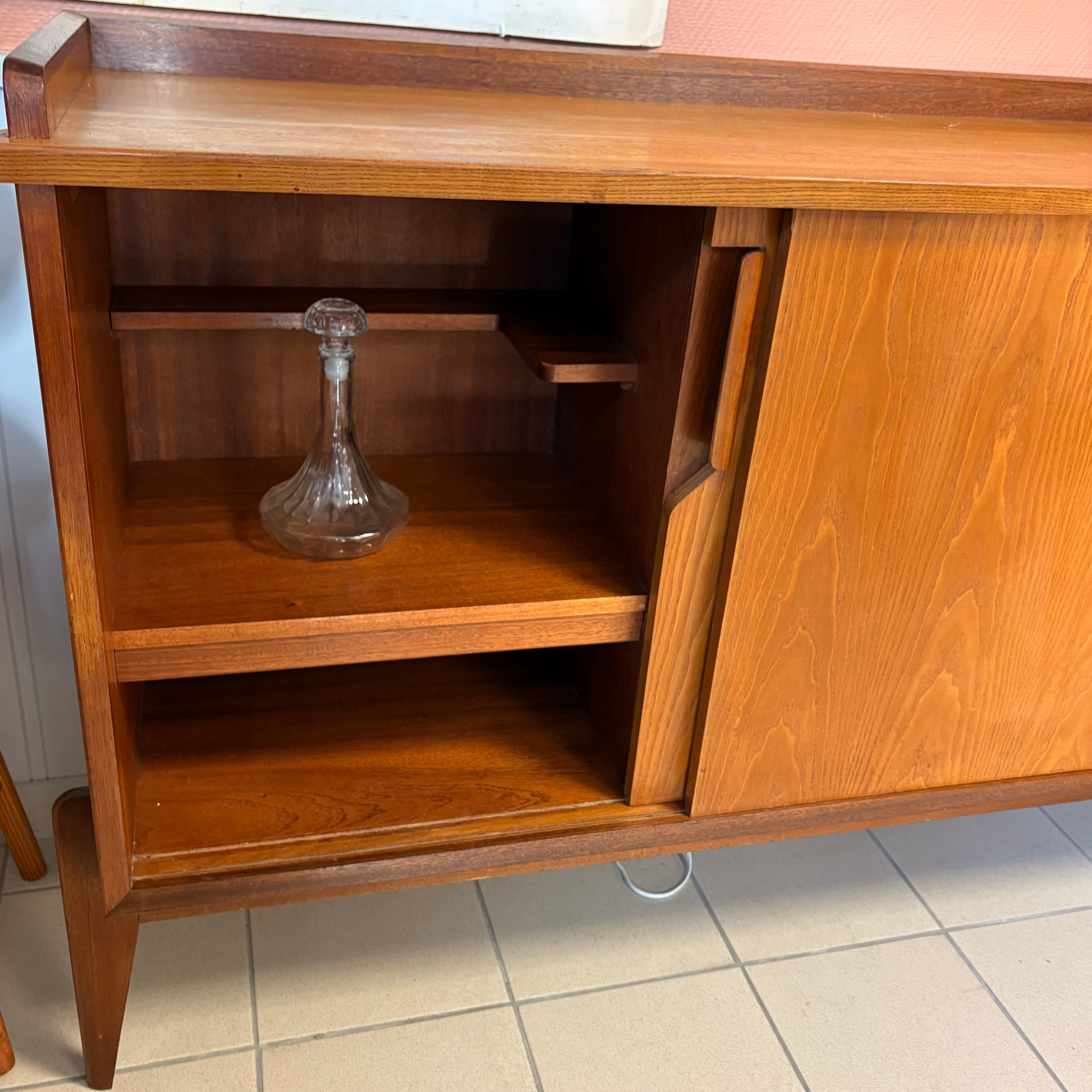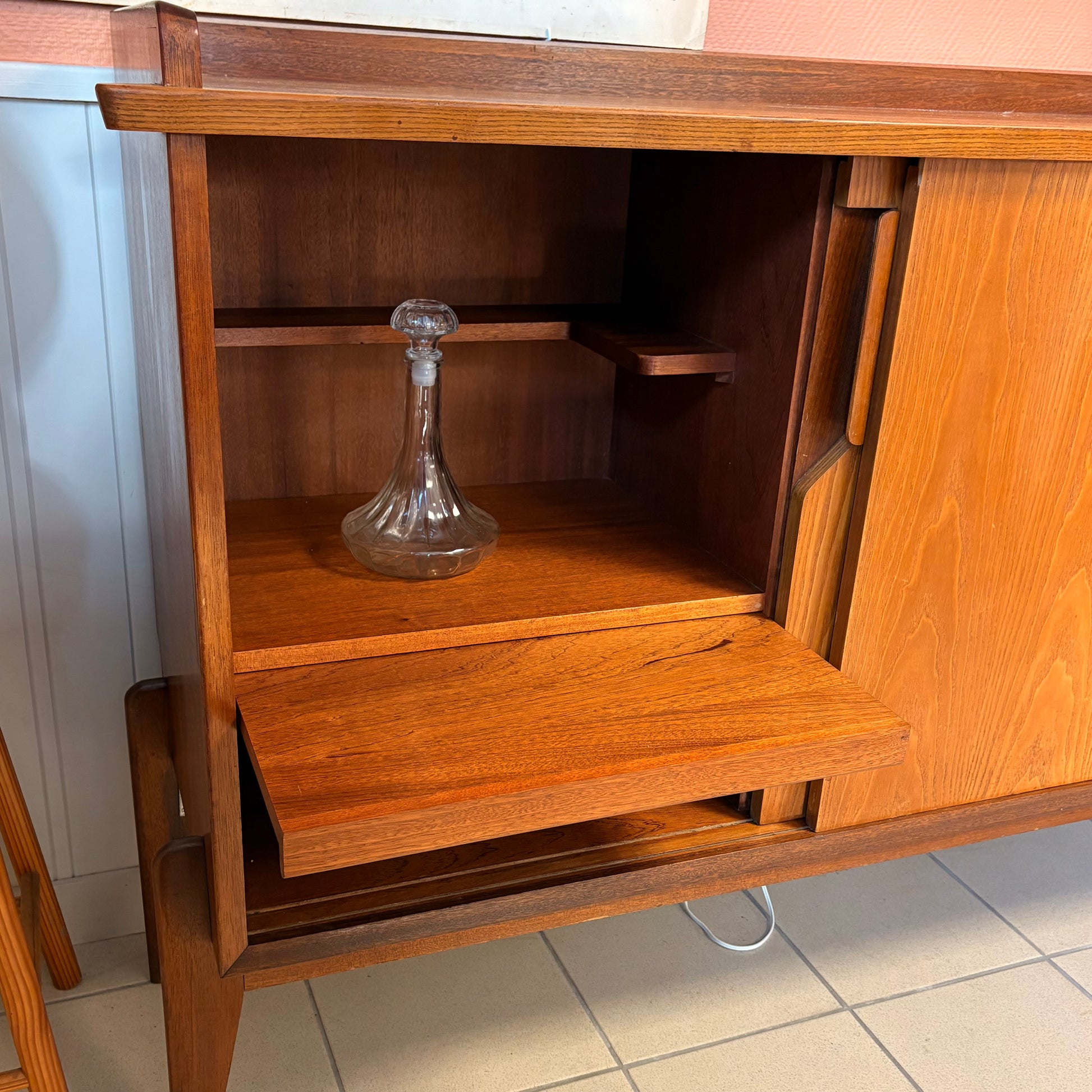 Meuble servant de bar, édité par Eros. Fabrication française des années 50. Frêne et acajou. D’imaginé par Gustave Gautier.