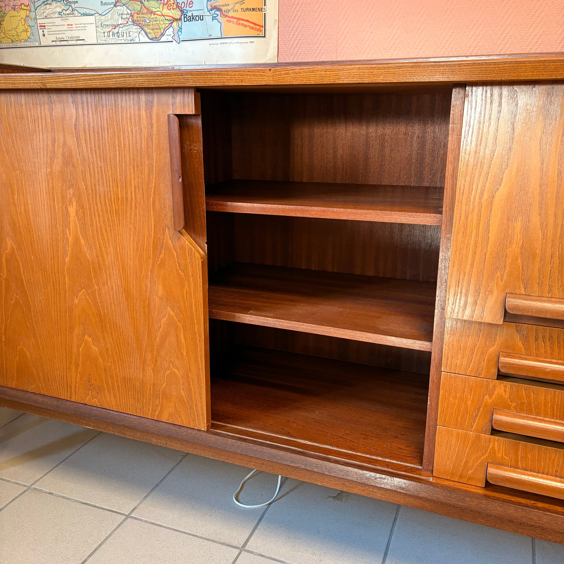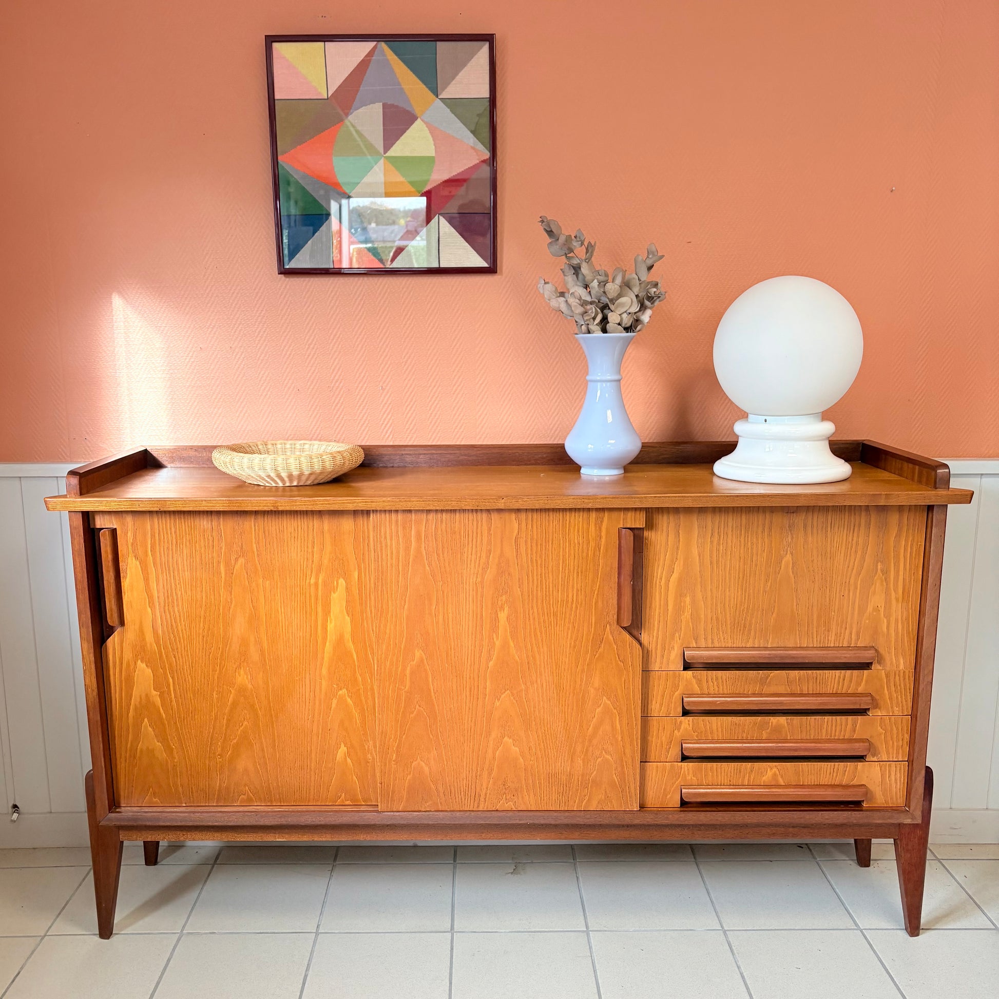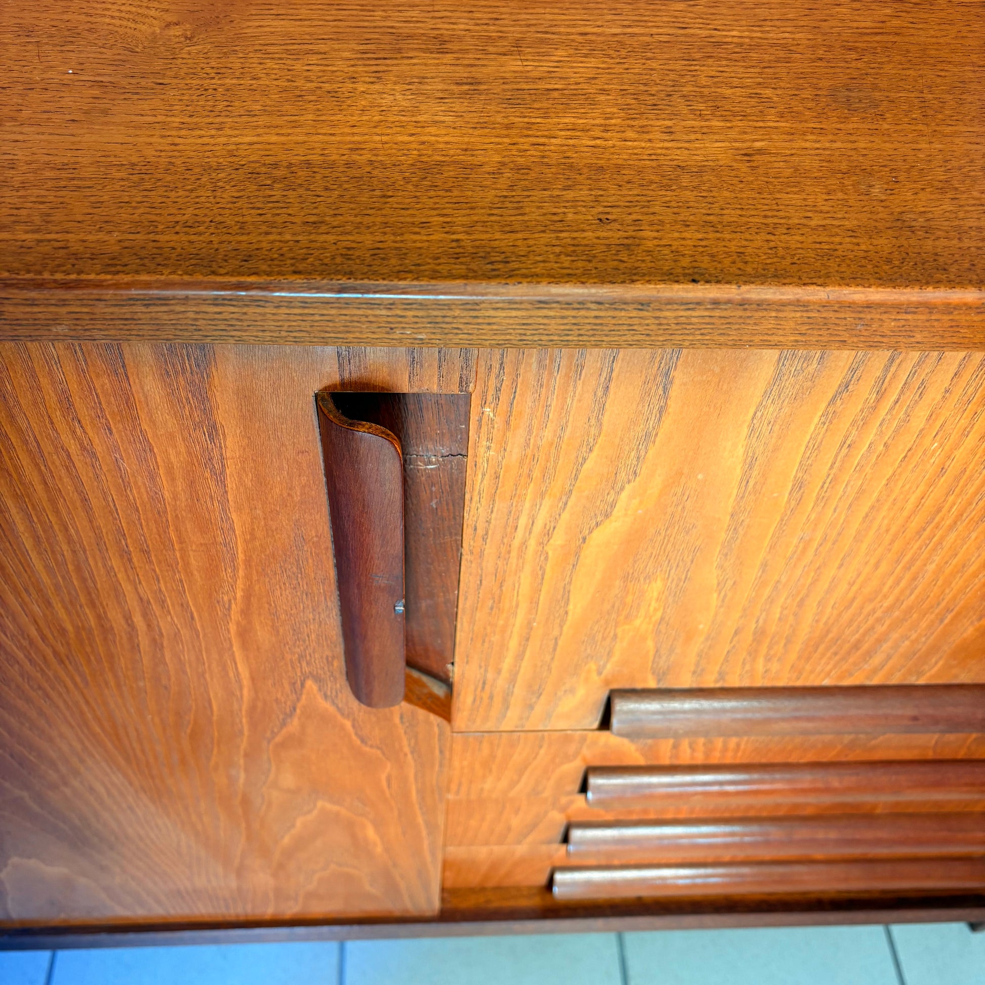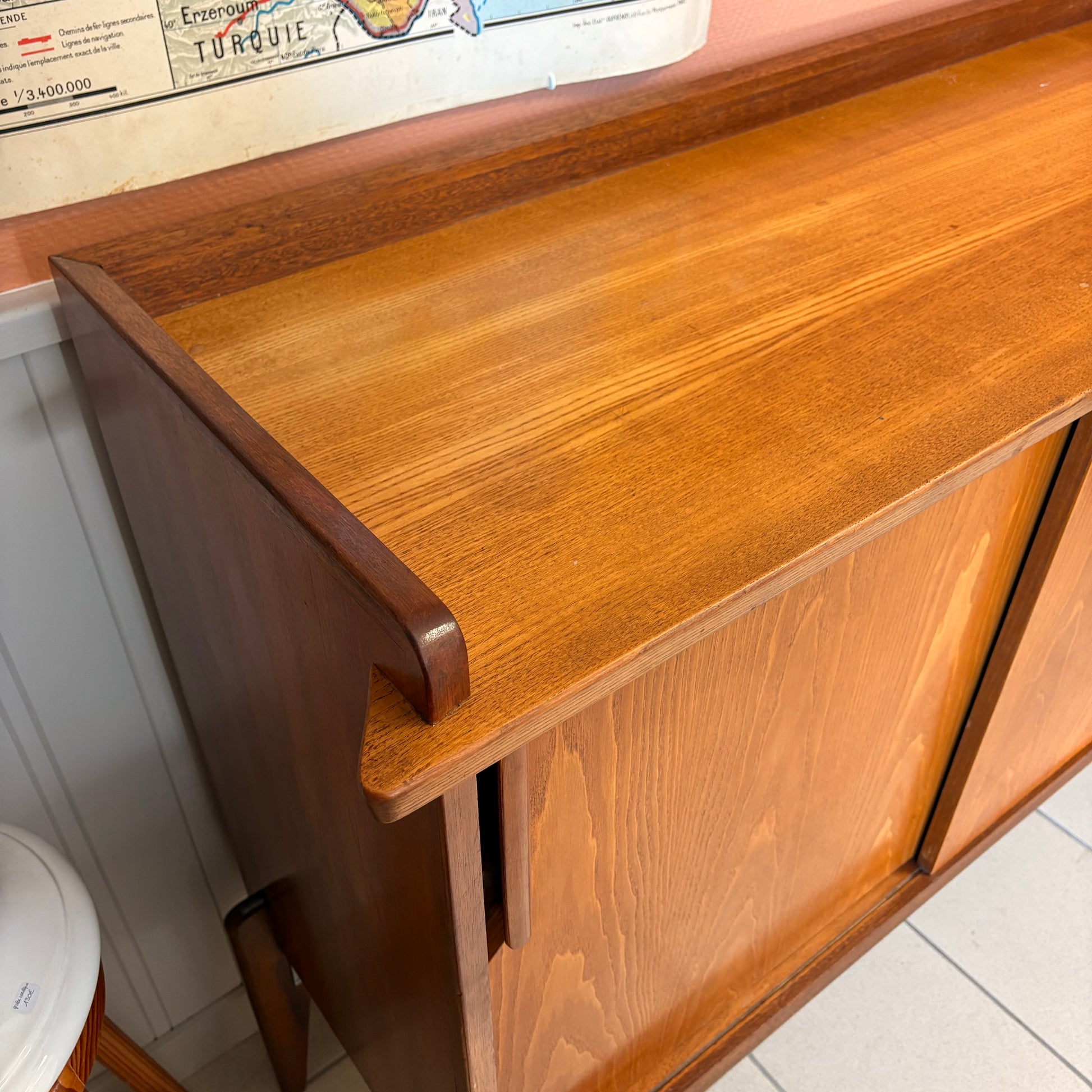 Meuble servant de bar, édité par Eros. Fabrication française des années 50. Frêne et acajou. D’imaginé par Gustave Gautier.