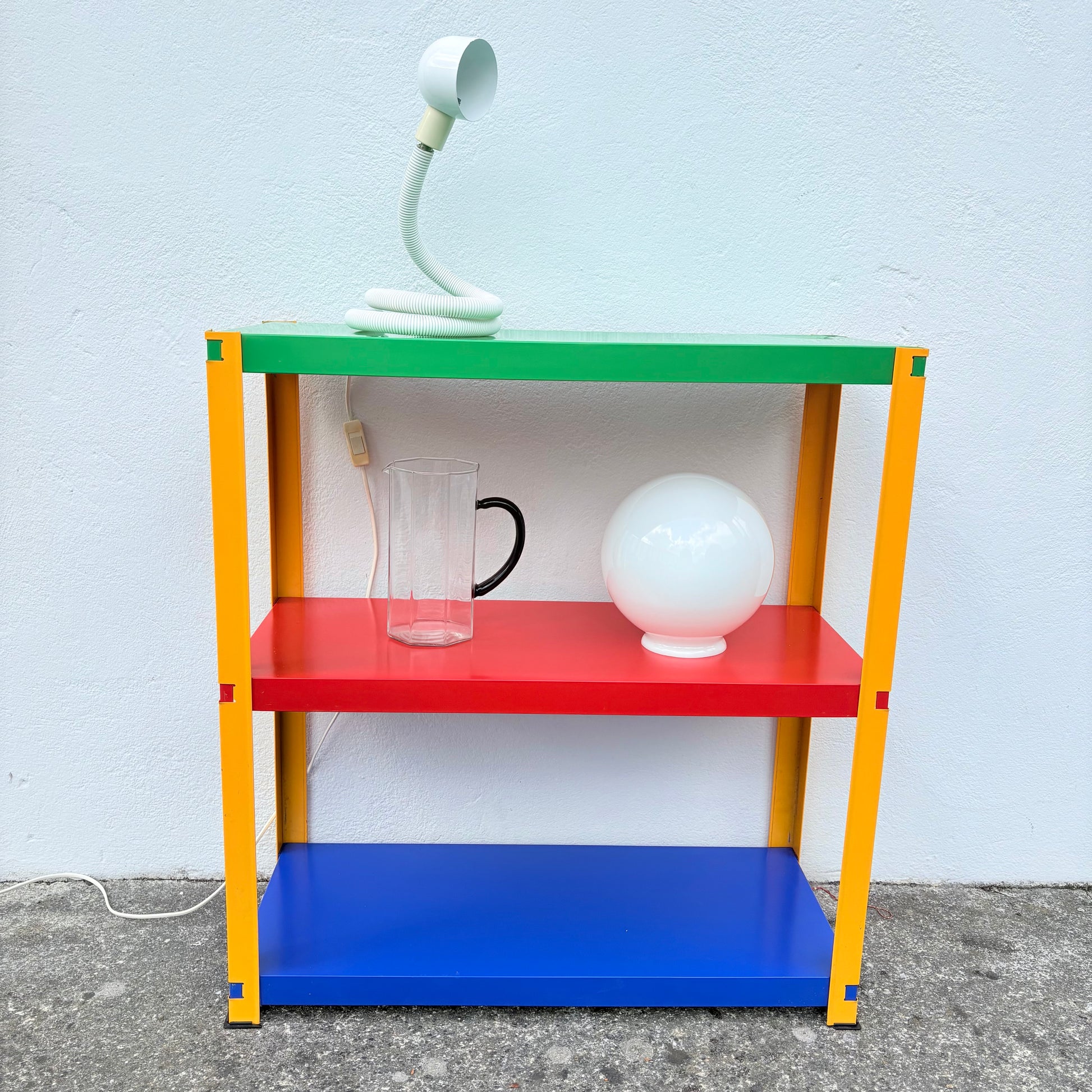Style Memphis, étagère colorée en métal. L’ensemble est entièrement démontable et les étagères peuvent être mises dans l’ordre souhaité