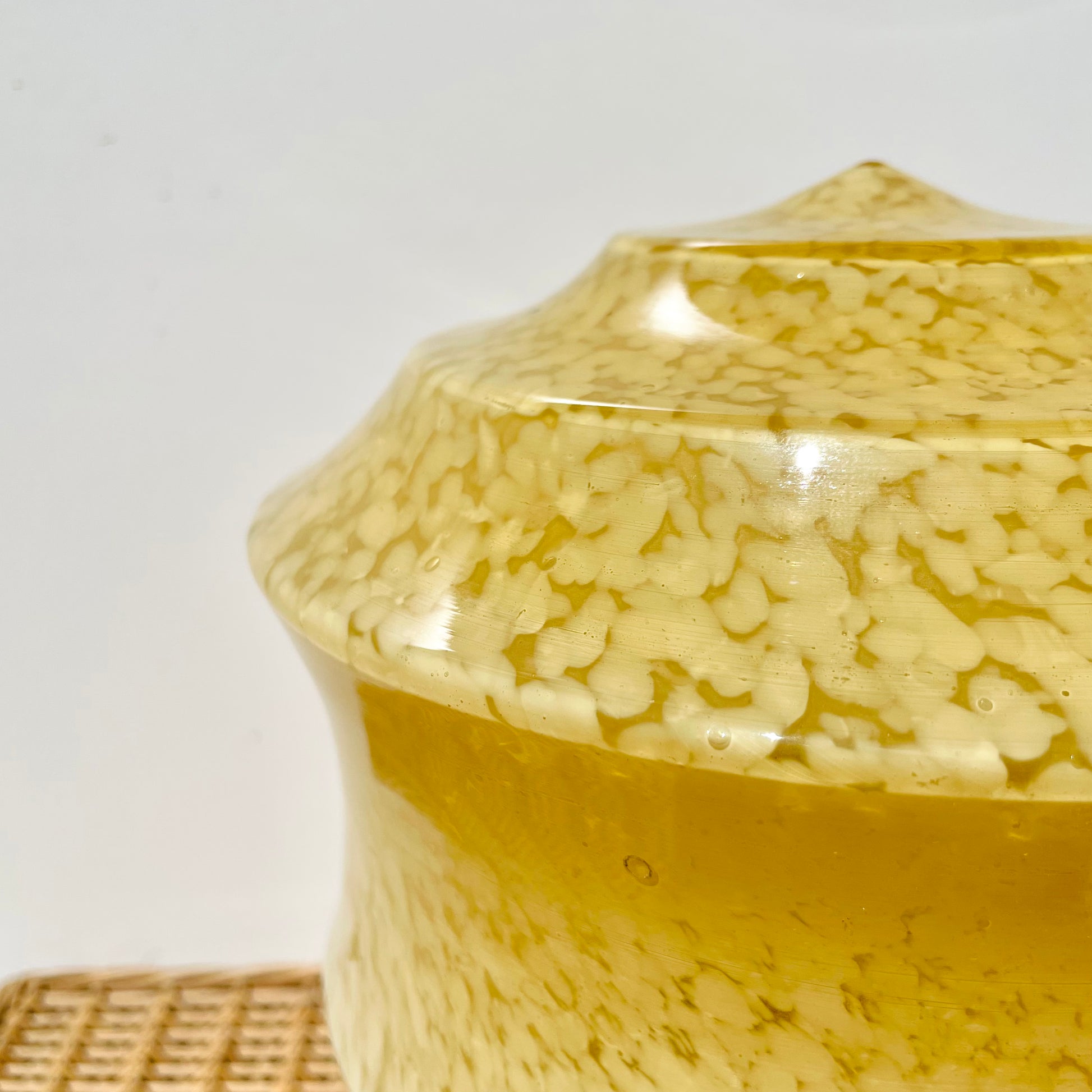 Joli verre de Clichy jaune. Ancien plafonnier monté en lampe à poser. Système électrique neuf. Prise et interrupteur noir.