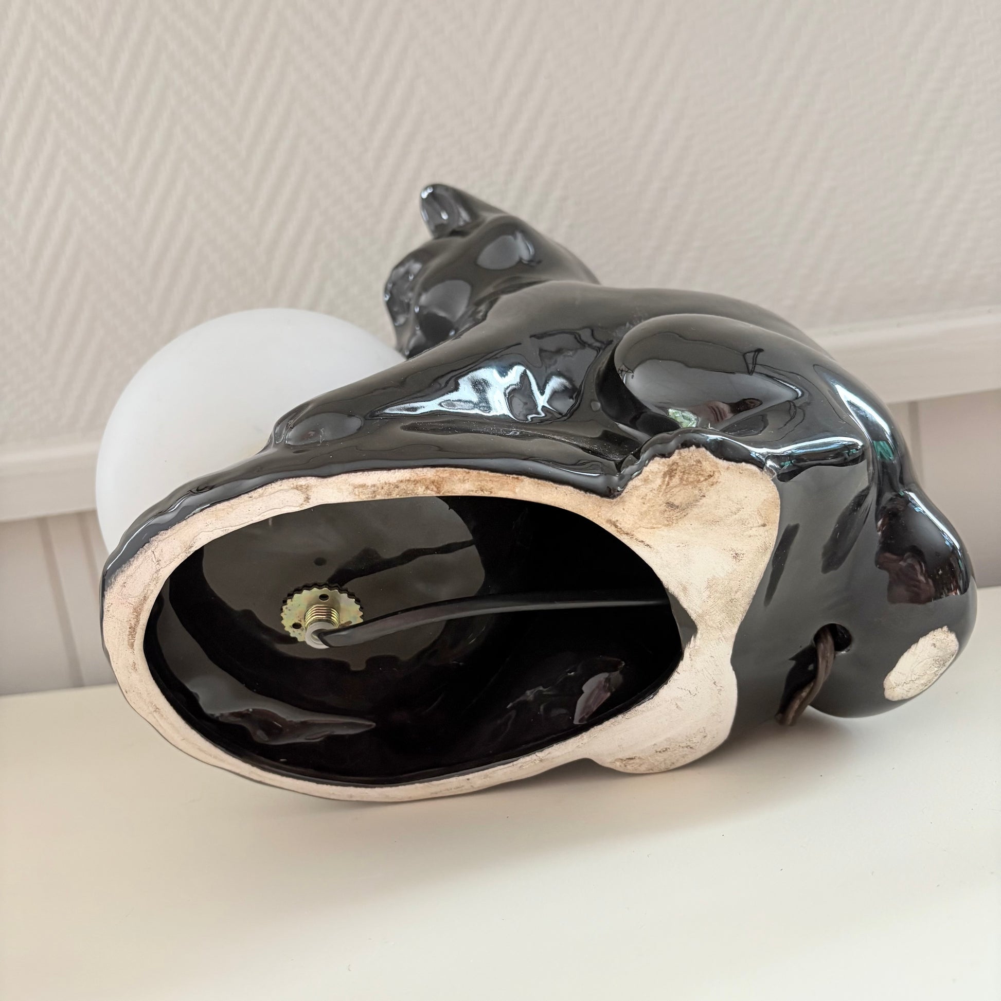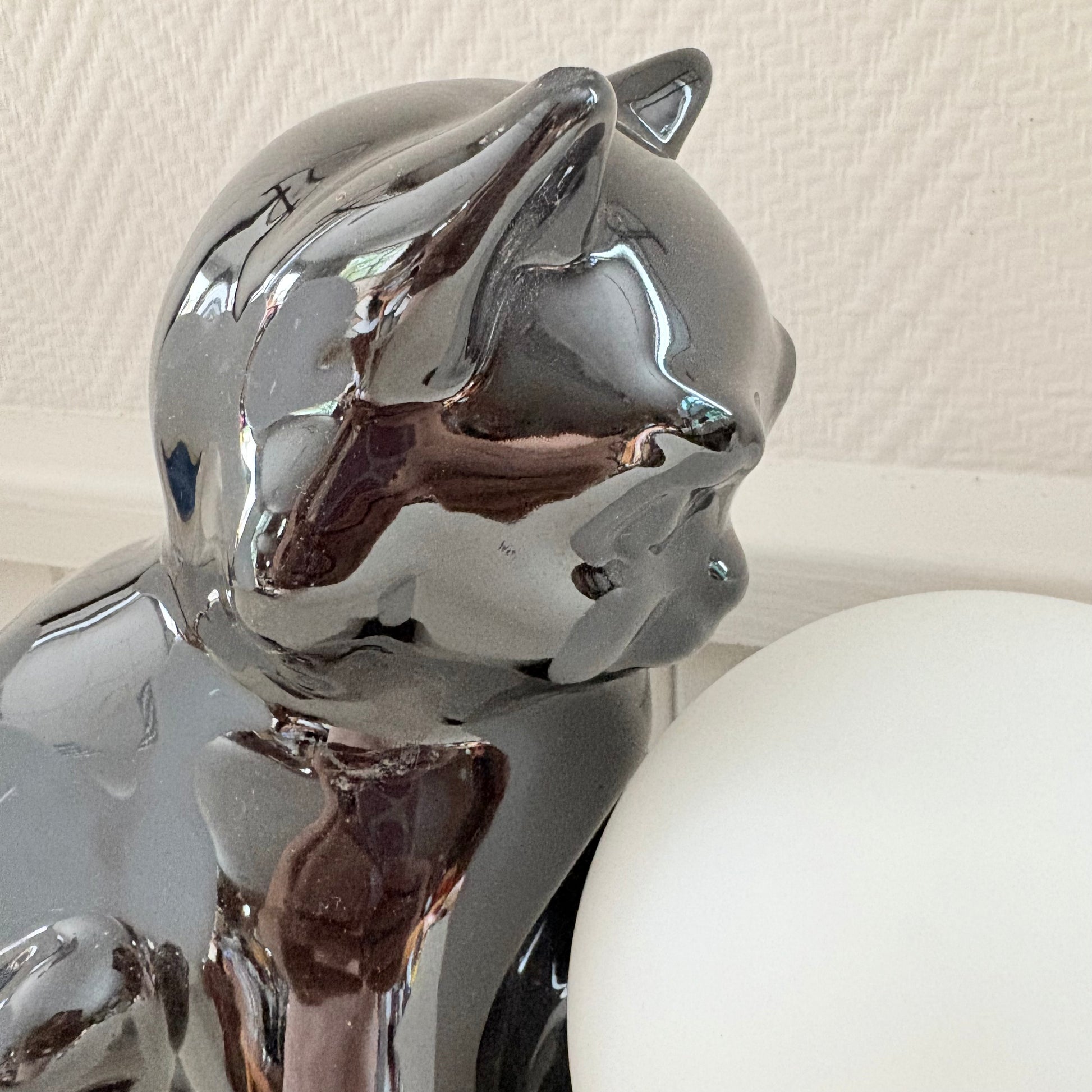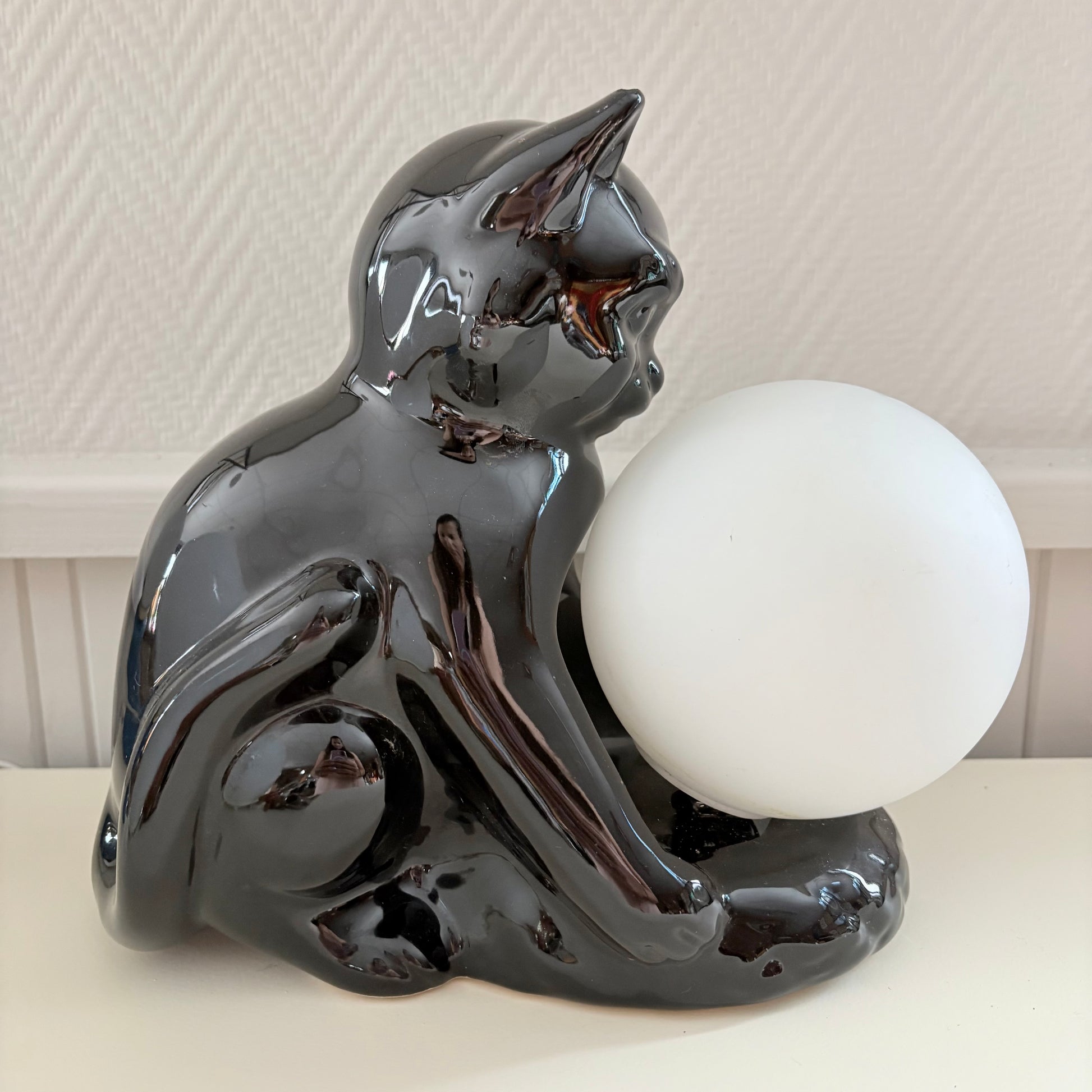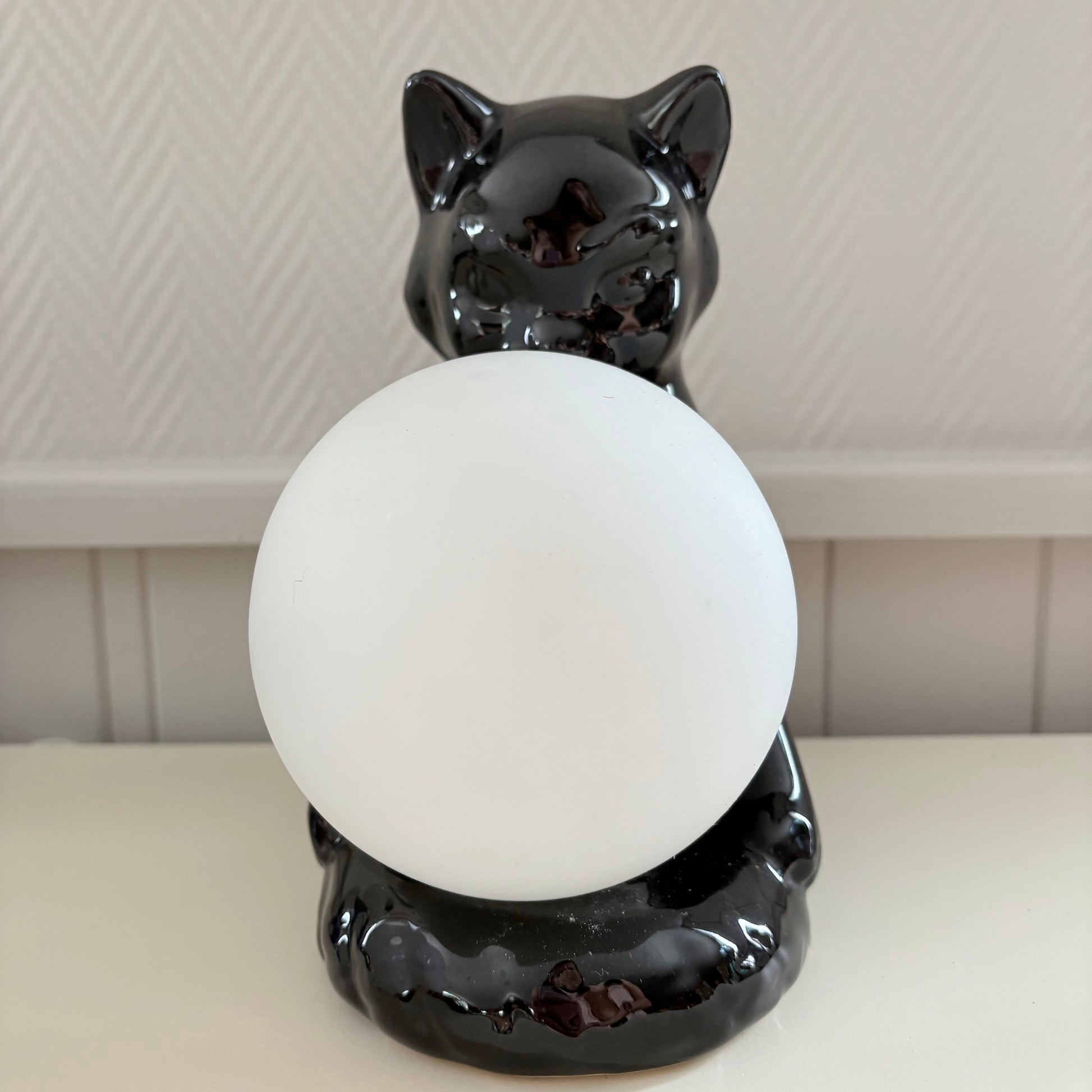 Lampe en céramique noire, globe. Petit chat en parfait état. Fonctionne parfaitement