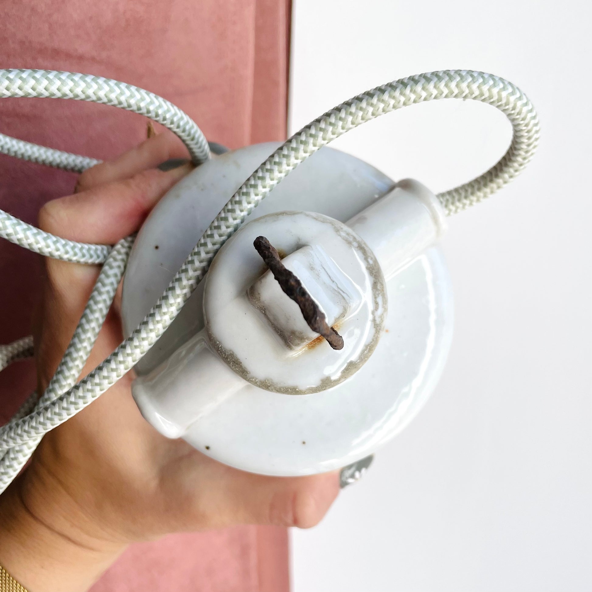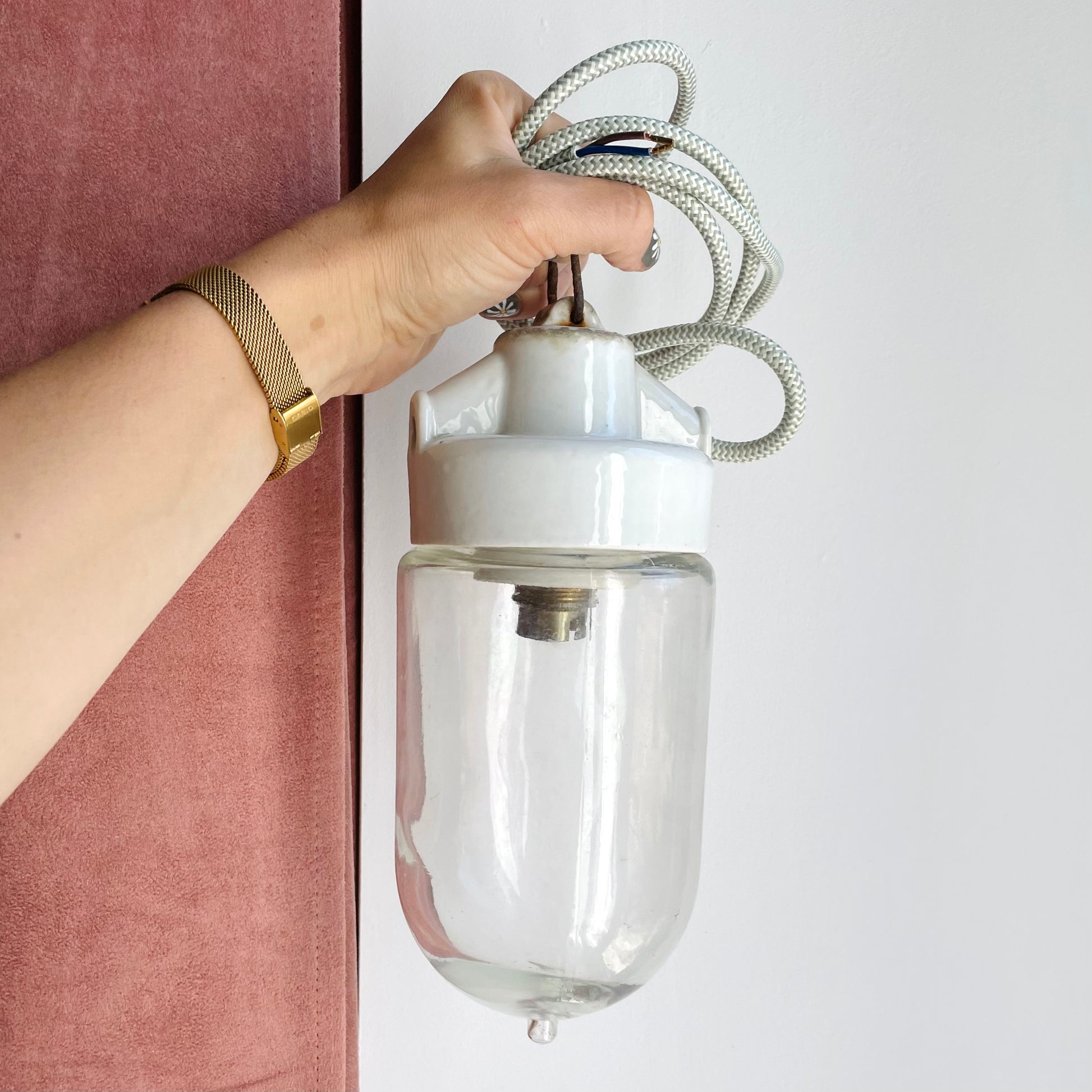 Cette lampe a longtemps éclairé une grange bretonne. Je l'imagine allumée chaque matin quand l'agriculteur venait s'occuper des bêtes. Elle était adaptée à l'extérieur mais les normes ont changé, et un joint est manquant donc elle ne sera destinée qu'à être mise à l'abri en intérieur à présent. Elle a été décrochée lorsque la longère a été rénovée, et heureusement préservée. La base en porcelaine est marquée par le temps, mais cela vous rappellera sa petite histoire! Système électrique remis en état. A vous de me dire si vous souhaitez une prise avec interrupteur (blancs) ou une rosace en porcelaine blanche, à définir par l’acheteur. Longueur de câble 1m40 max.