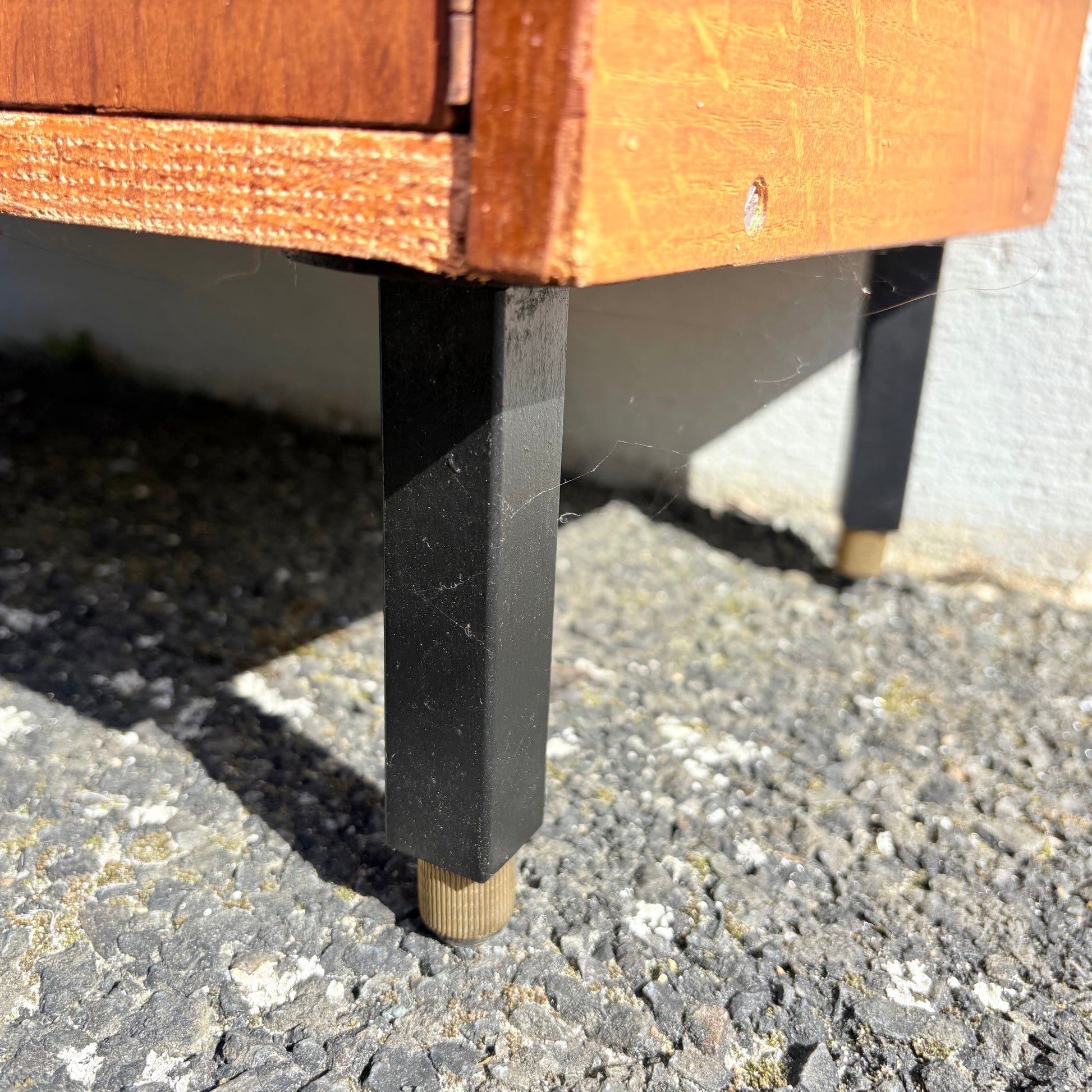 Meuble de rangement en placage, poignées plastique noir d’origine. Plateau peint en noir. Une étagère