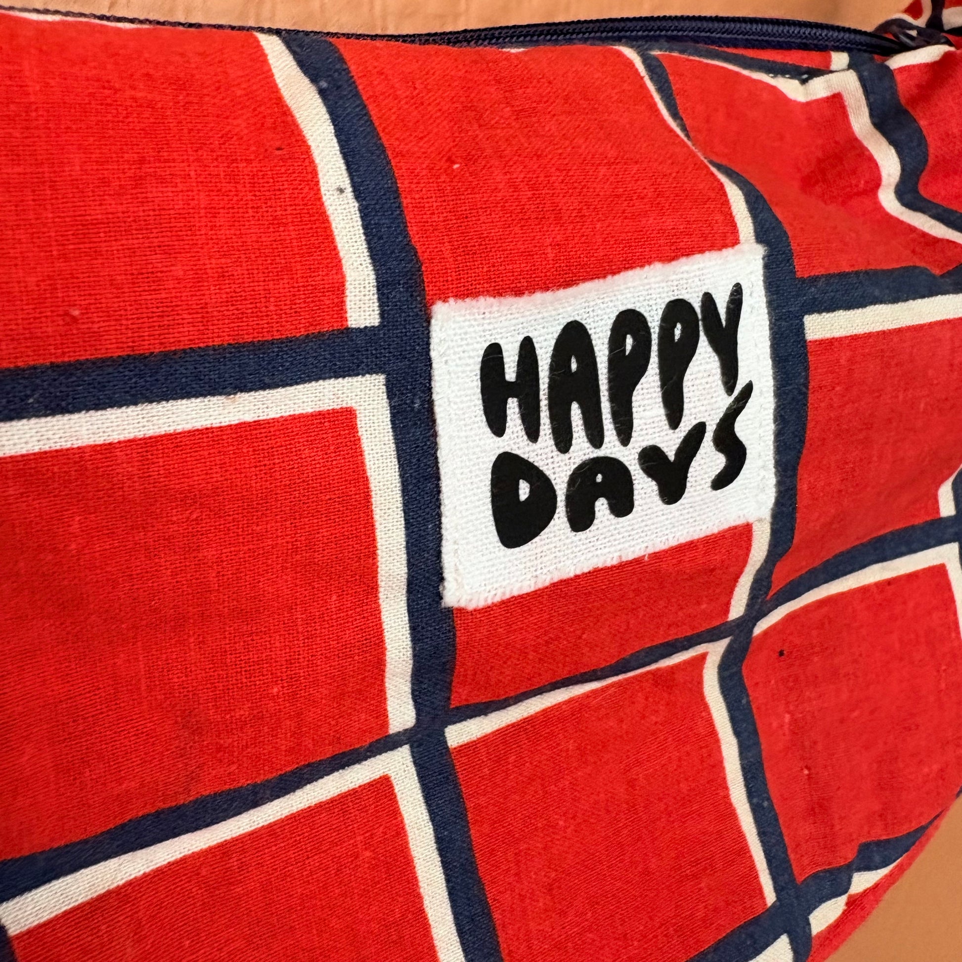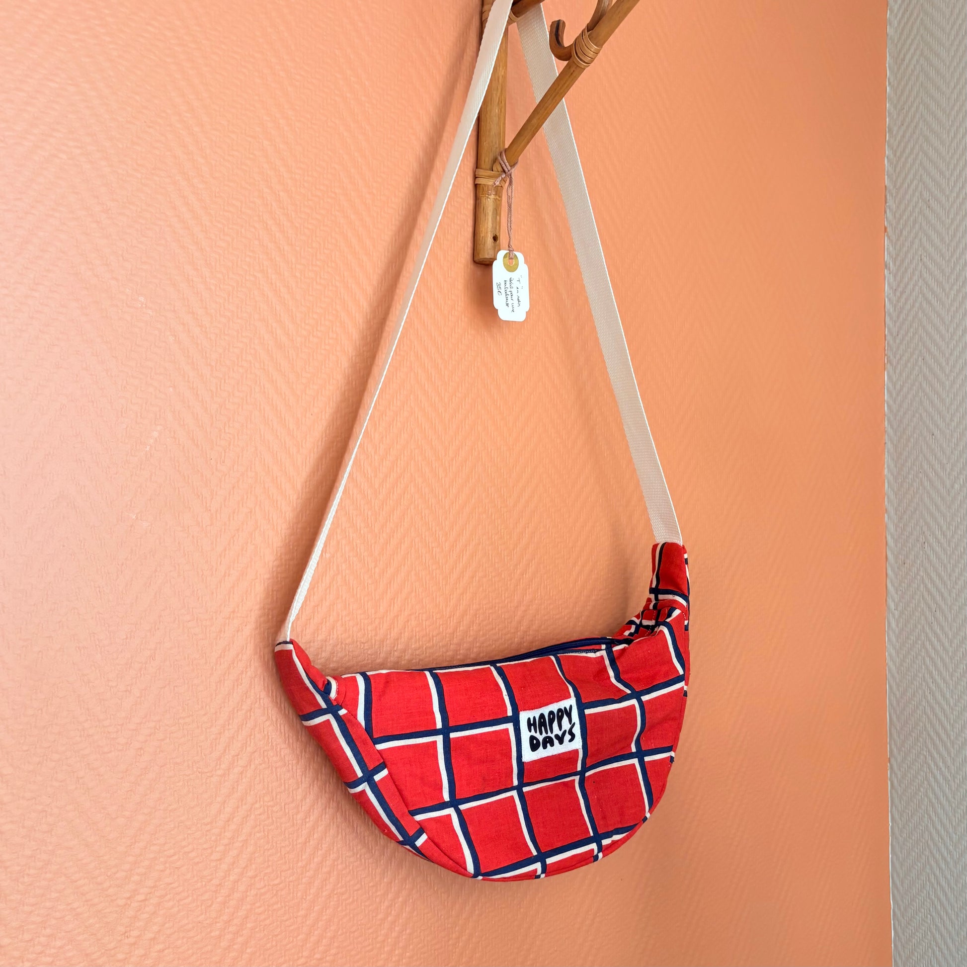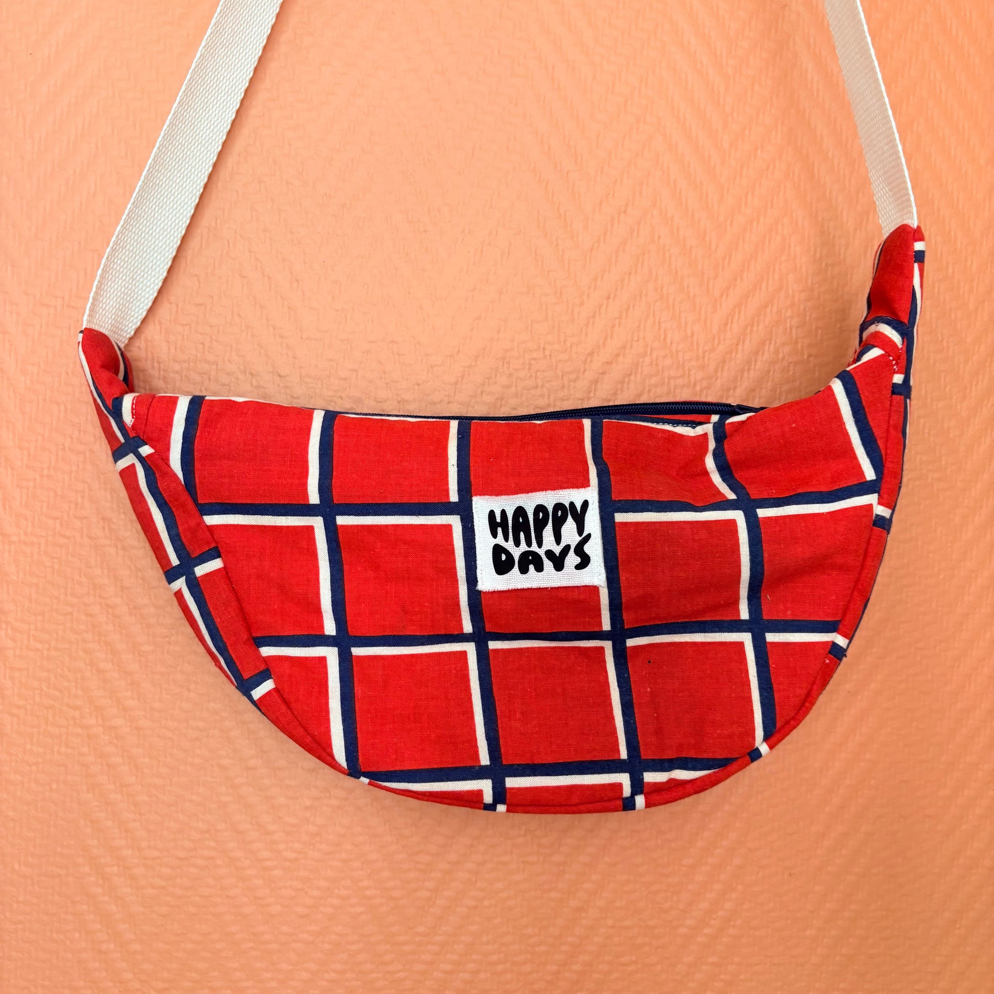 Sac demi lune fait main. Tissu ancien, toile de parasol à carreaux .