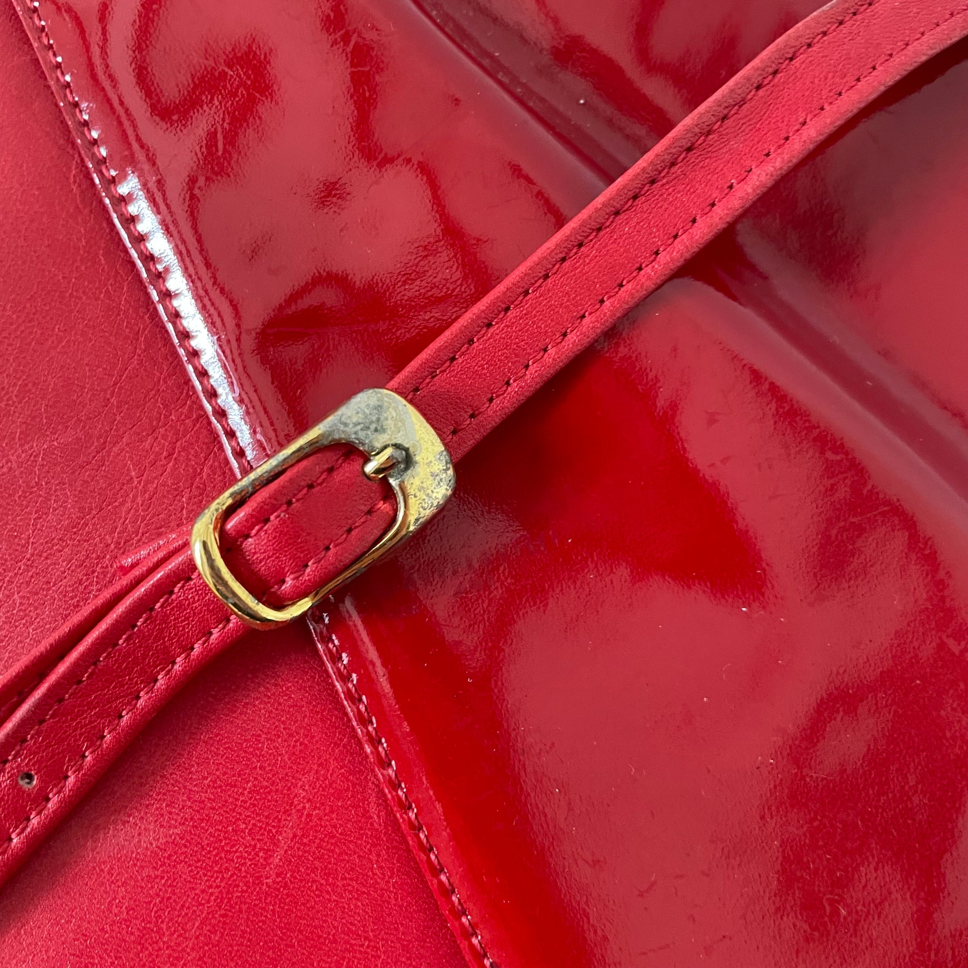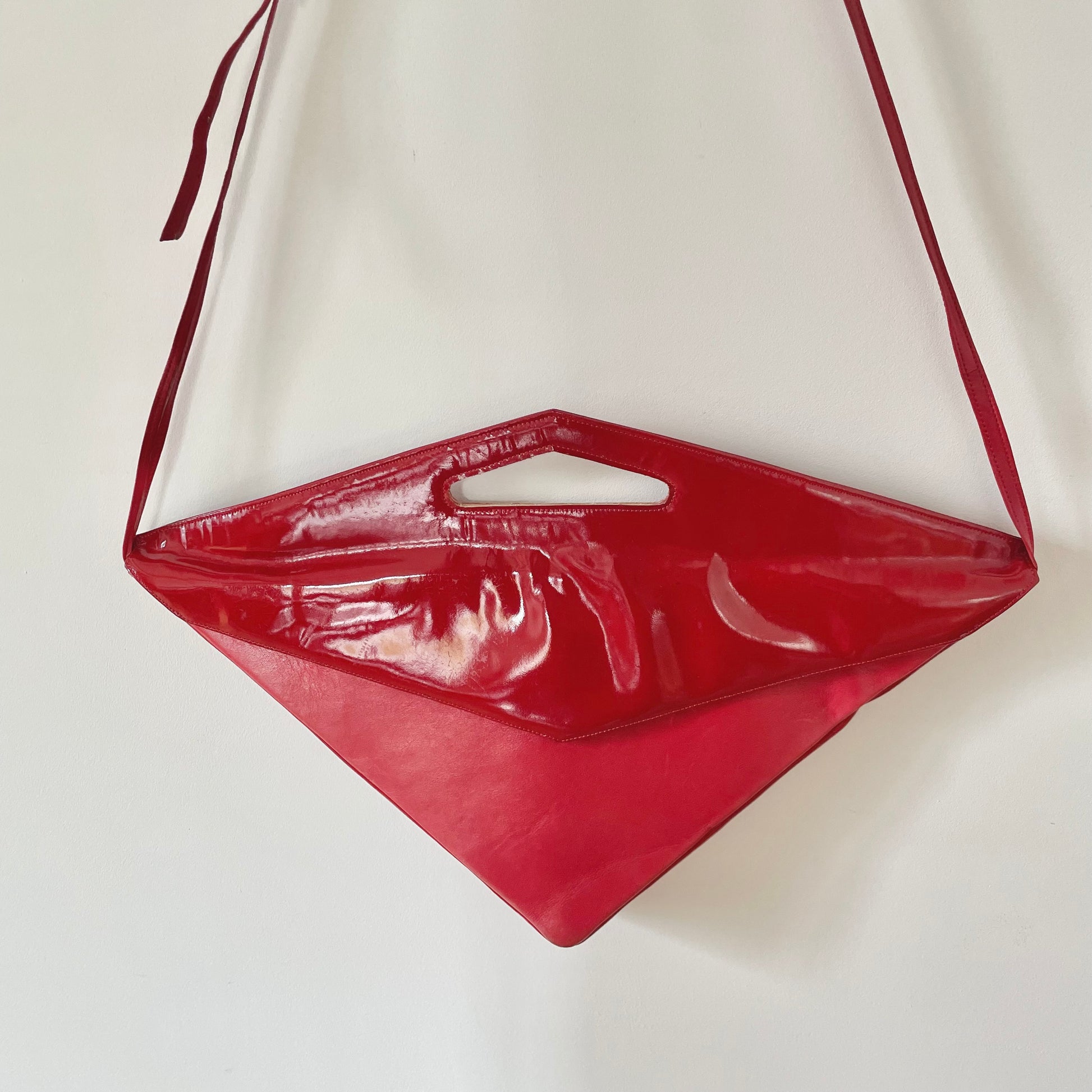 Incroyable sac triangle rouge, vintage. Détails vernis. En similicuir. De très bonne qualité et en superbe état.