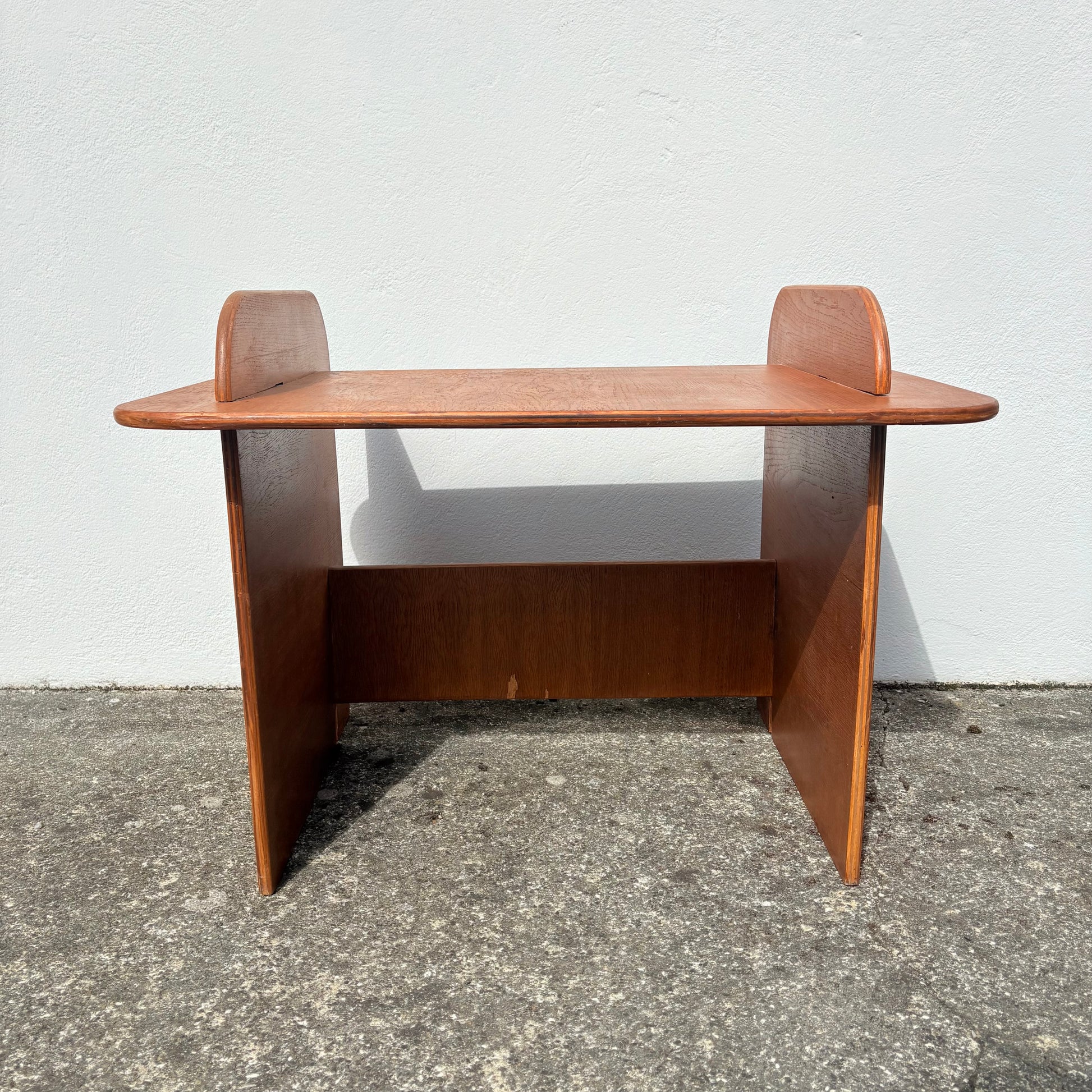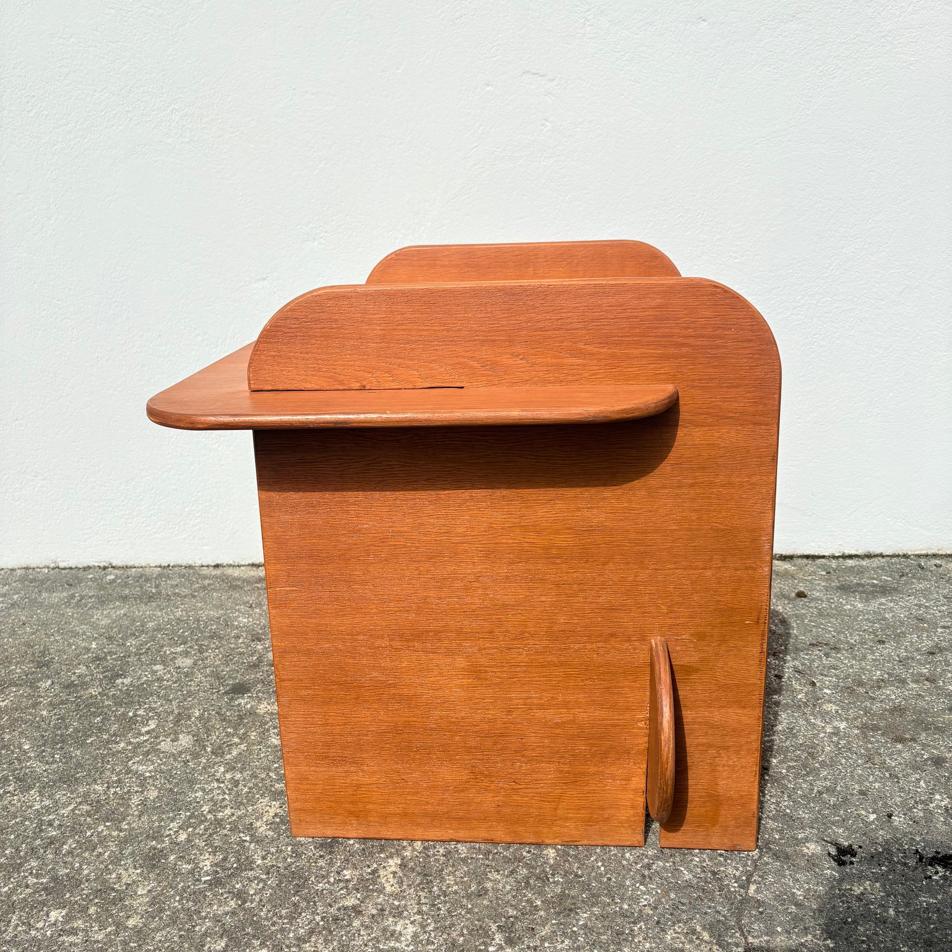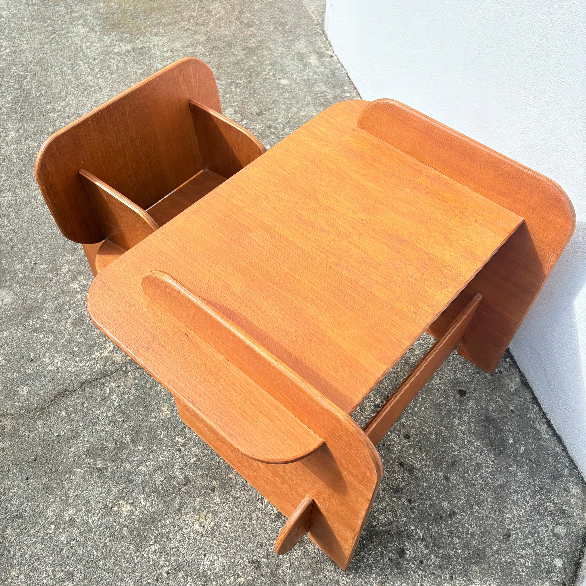 Ensemble chaise et bureau enfant. Pièce unique, travail d’artisan, ancien. Look résolument moderne cependant. Se monte et se démonte sans vis. Quelques éclats de placage à signaler.