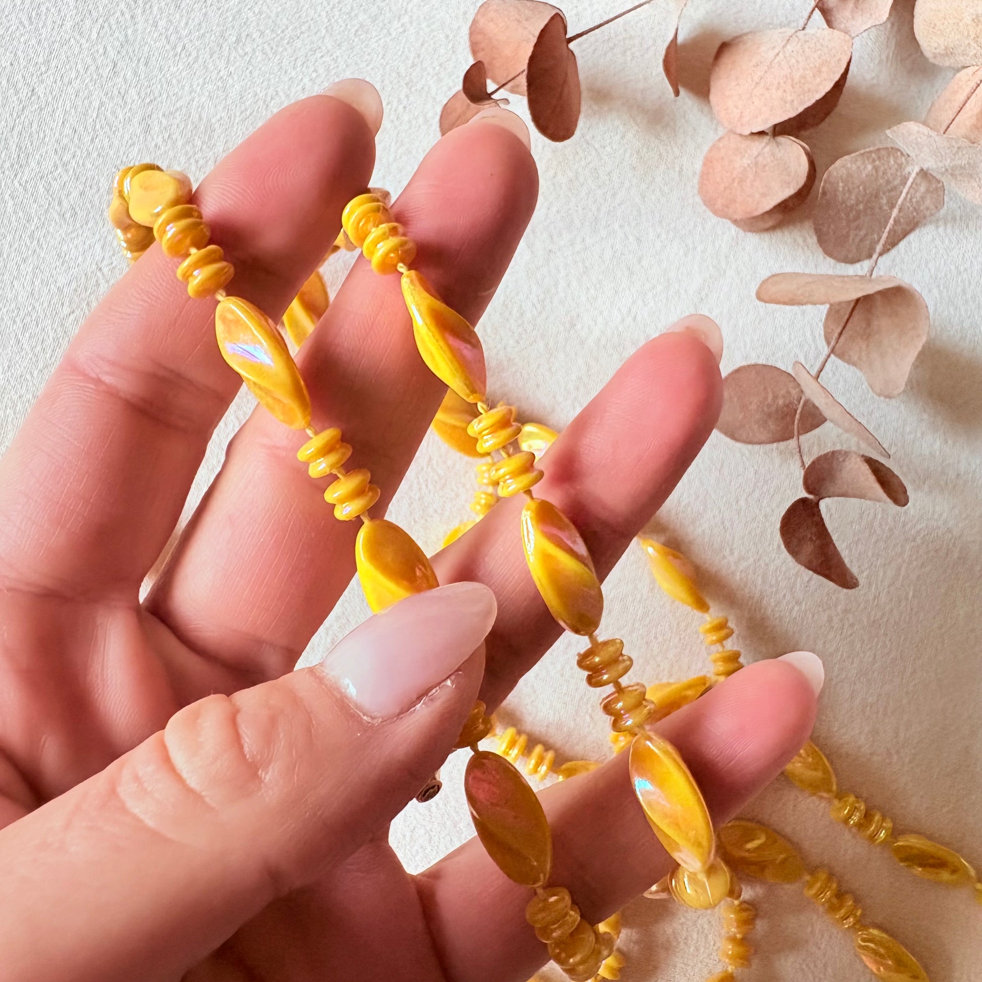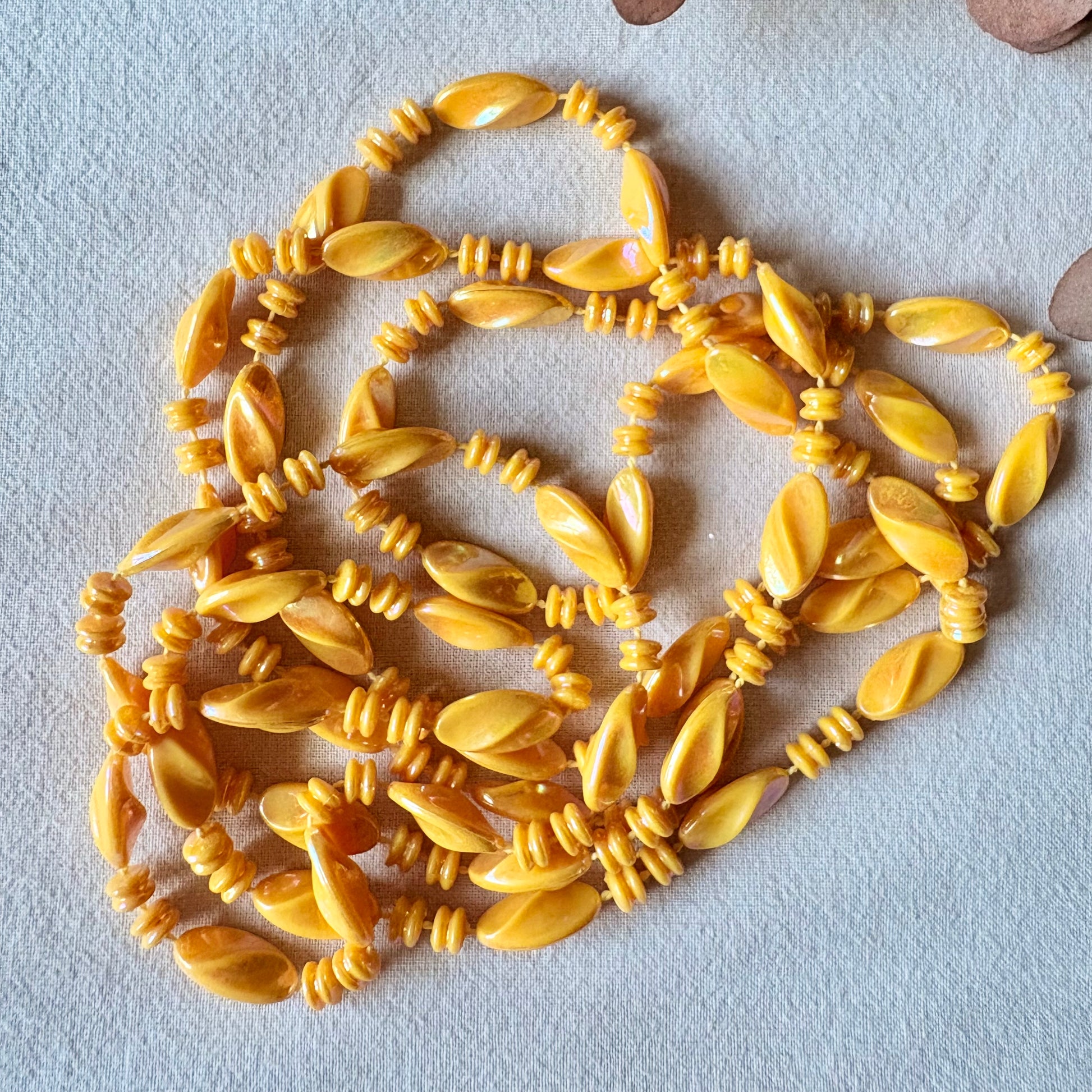 Sautoir ancien, perles plastiques jaune irisé