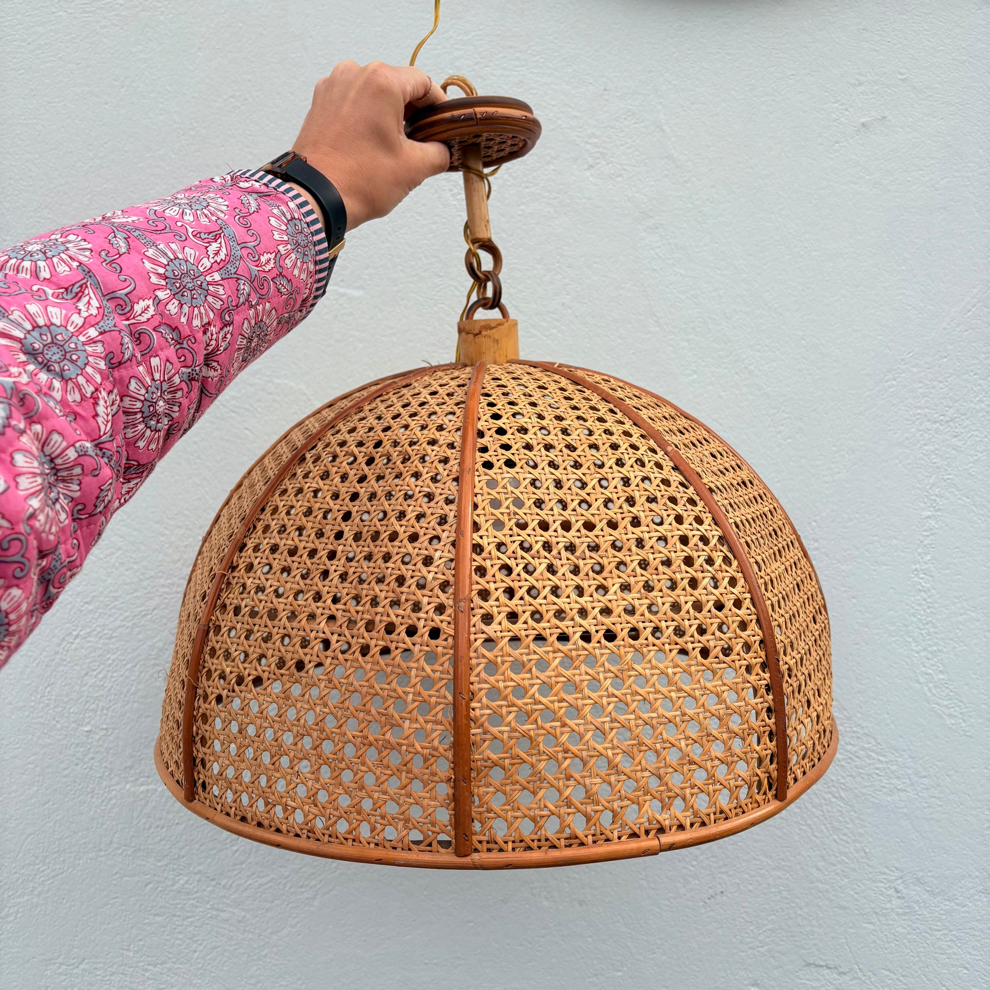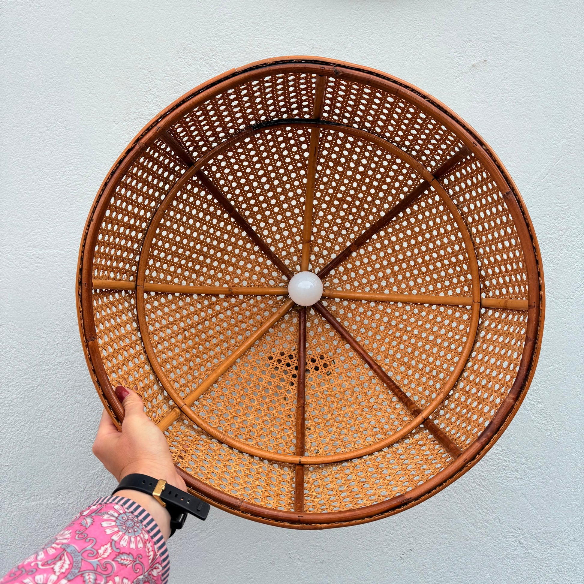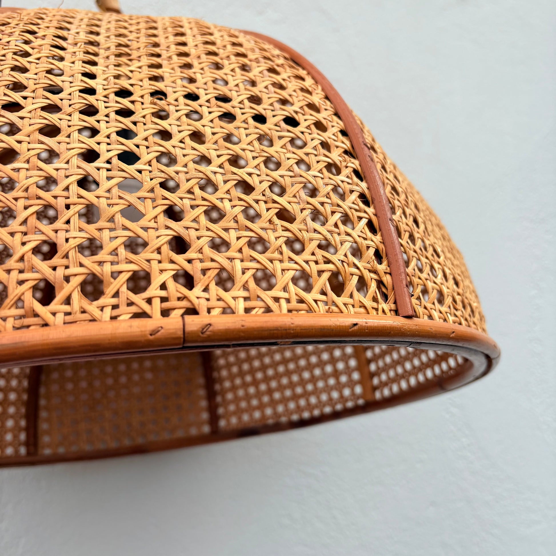 Suspension provenant d'Italie, fabriquée dans les années 60. Parfait état. Très grand diamètre. Rotin et cannage.