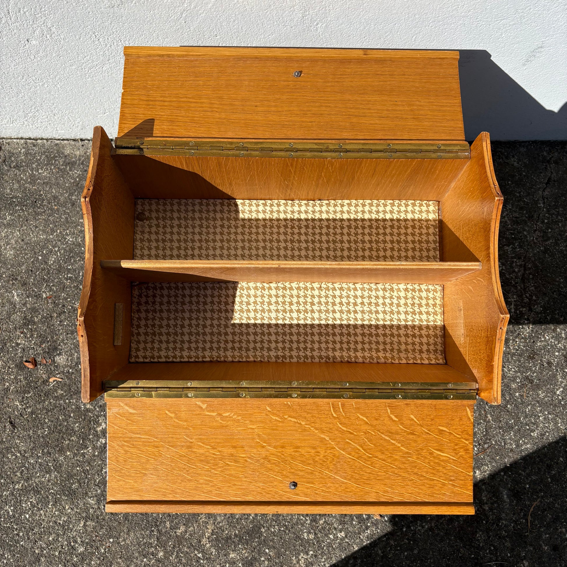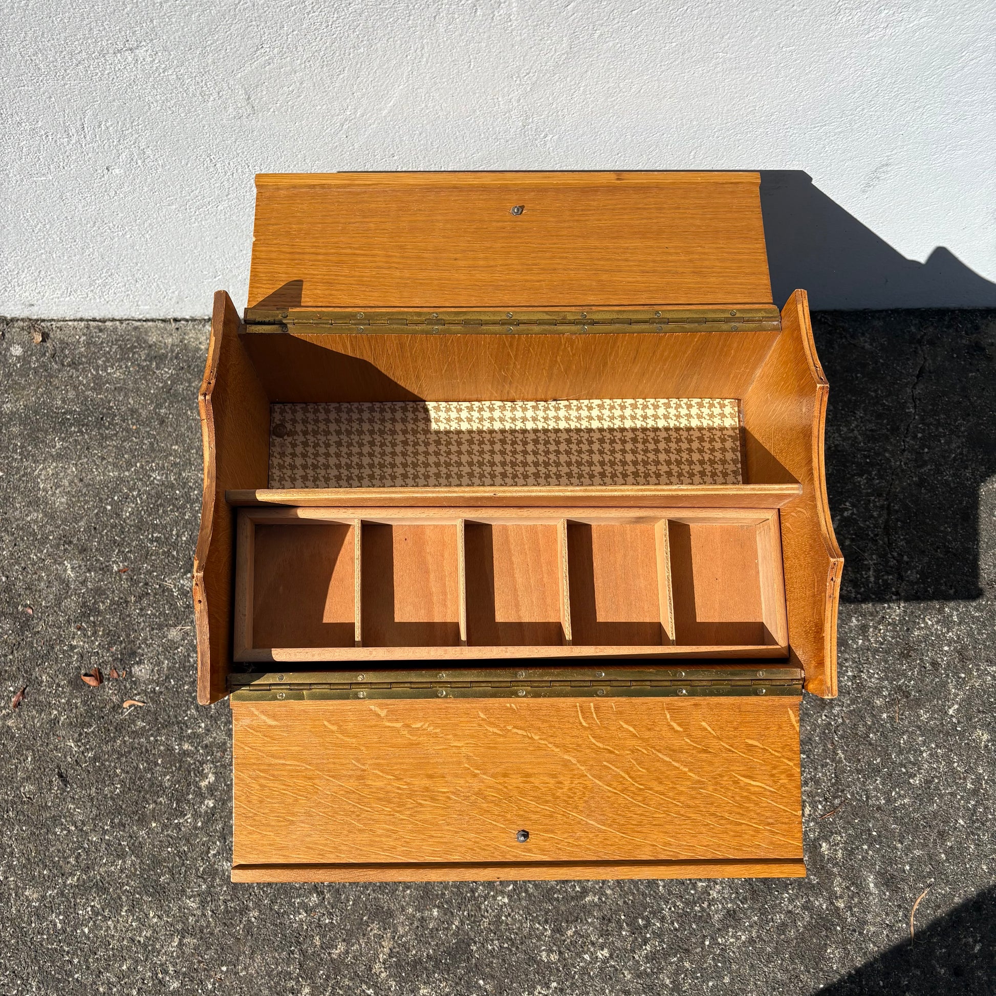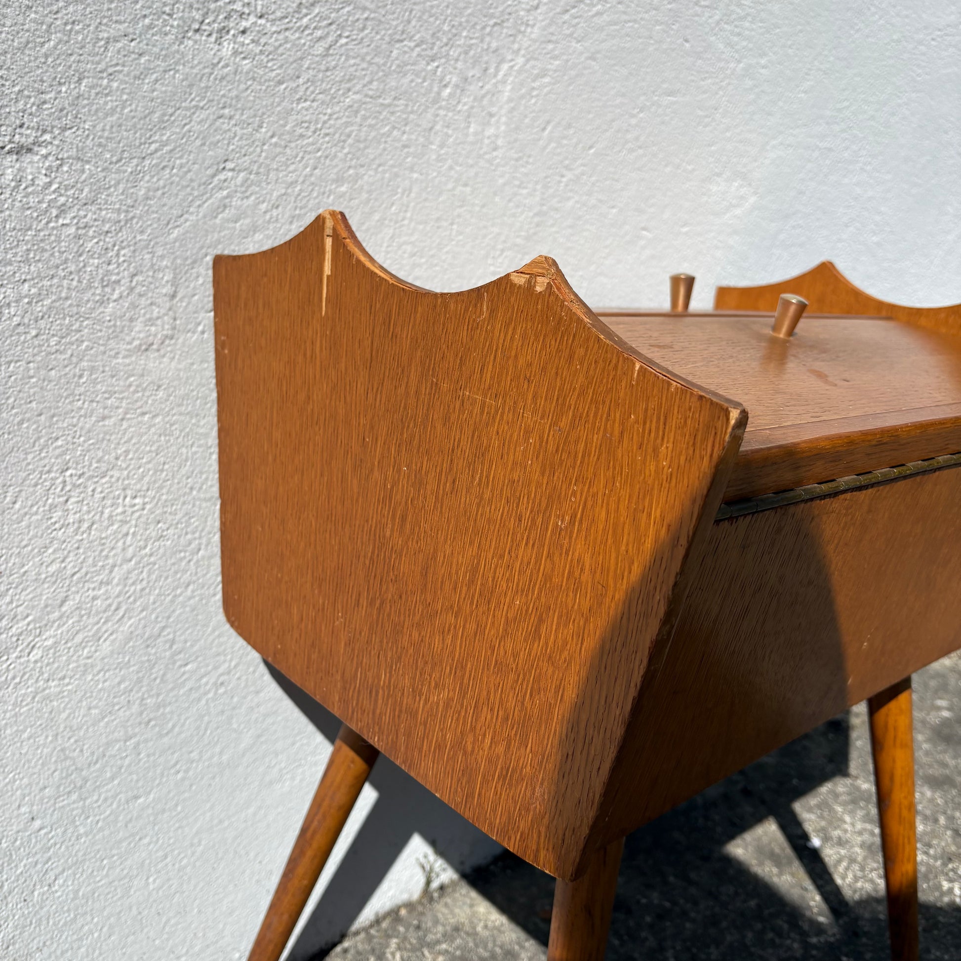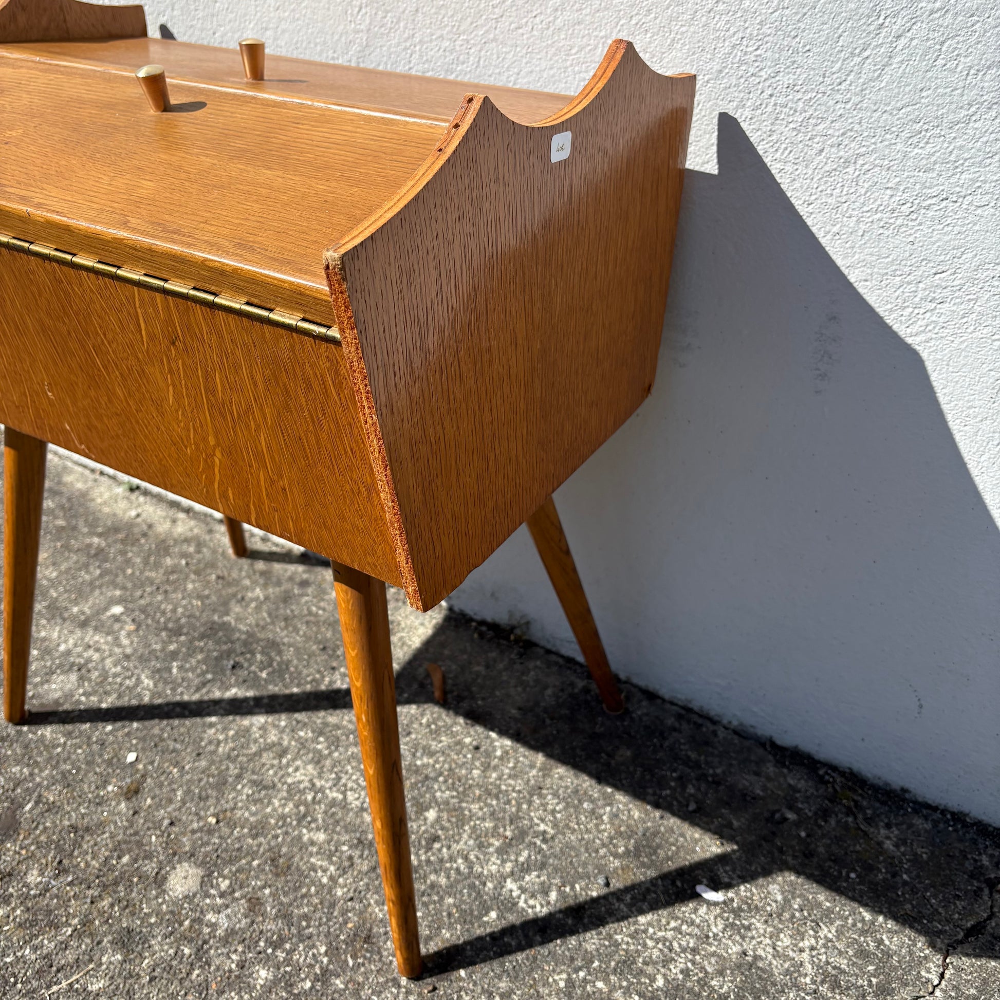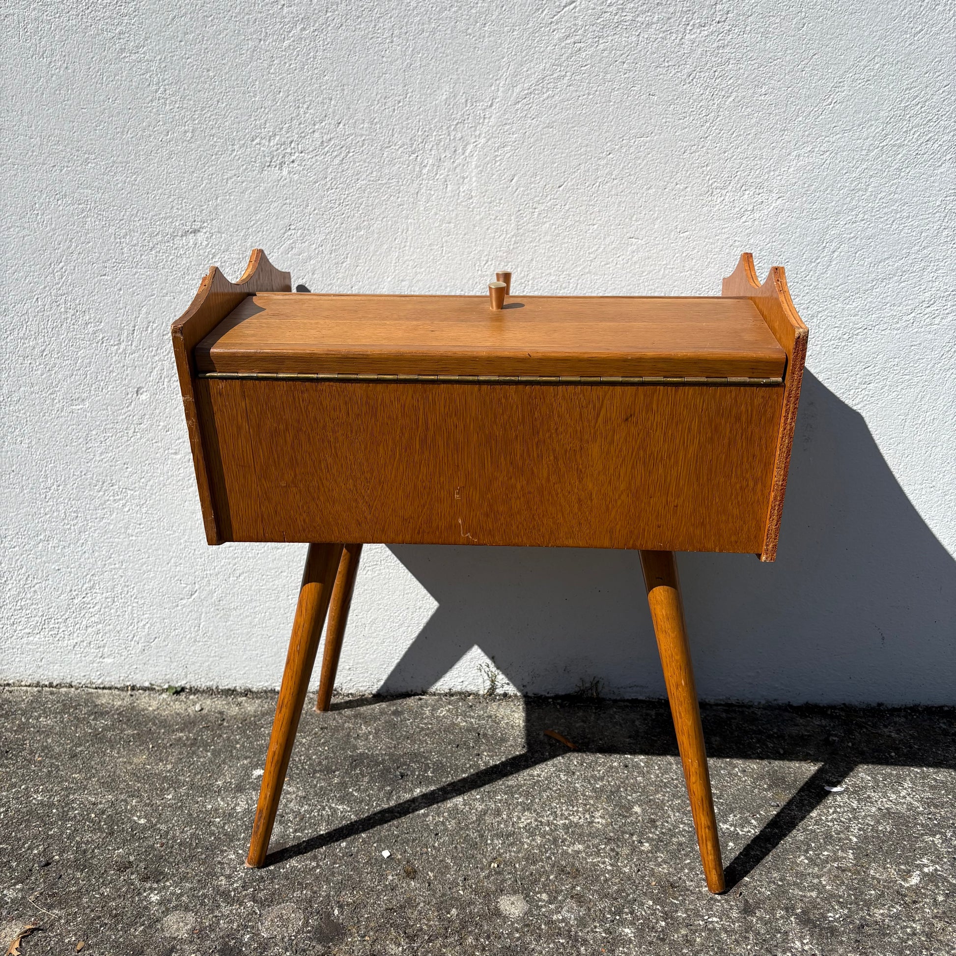 Travailleuse ancienne. Pieds compas. Attention accident sur un côté. (À l’origine il y avait sans doutes une poignée qui s’est cassée) Pour le reste très pratique et esthétique! Détails pied de poule